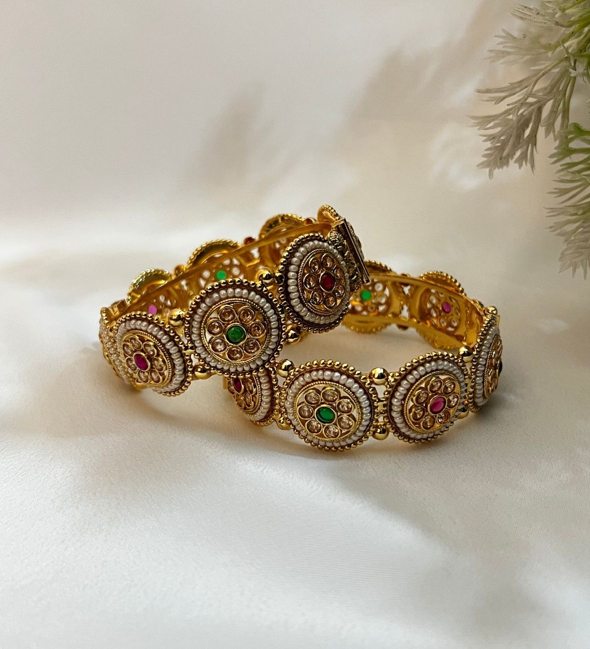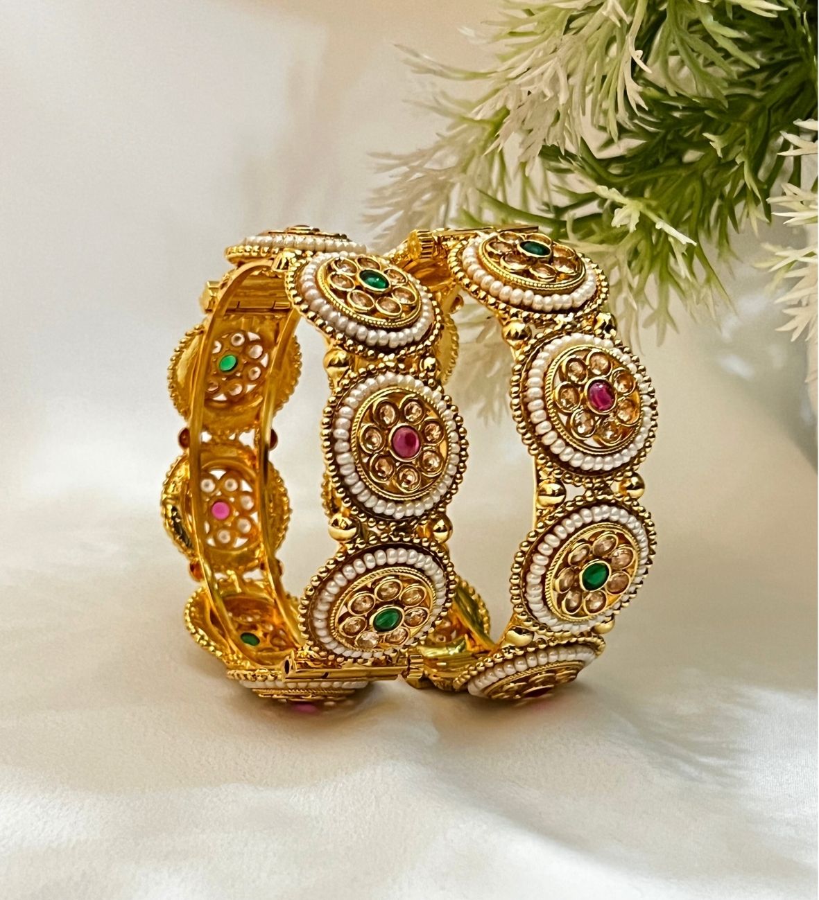 Add timeless elegance to your jewellery collection with this royal kundan pearl bangle. Designed with intricate kundan work, delicate pearl detailing and rich red and green stones, this bangle is perfect for brides, weddings, festive occasions and traditional celebrations. Its regal gold finish makes it a statement piece that pairs beautifully with lehengas, sarees, and anarkalis.