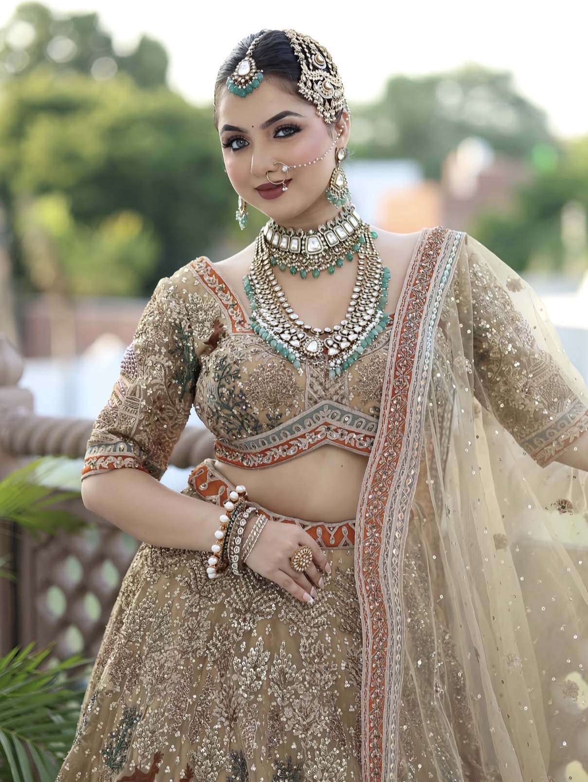 Contains: Customisation available for Bridal Kundan Necklace Set with Green Beads and Polki Stones, that’s discussed over appointment