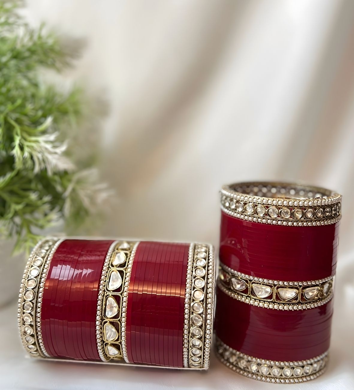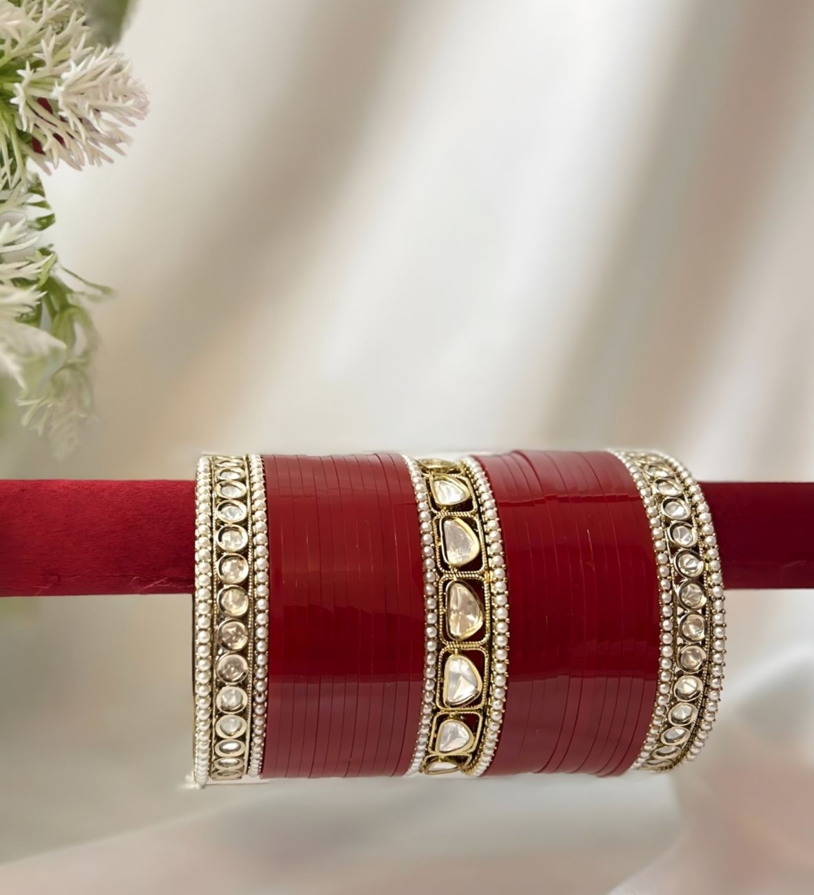 Perfect for brides, this chuda set pairs beautifully with lehengas, sarees, and other wedding ensembles. The structured design ensures a graceful look while maintaining comfort for extended wear during wedding rituals and celebrations.