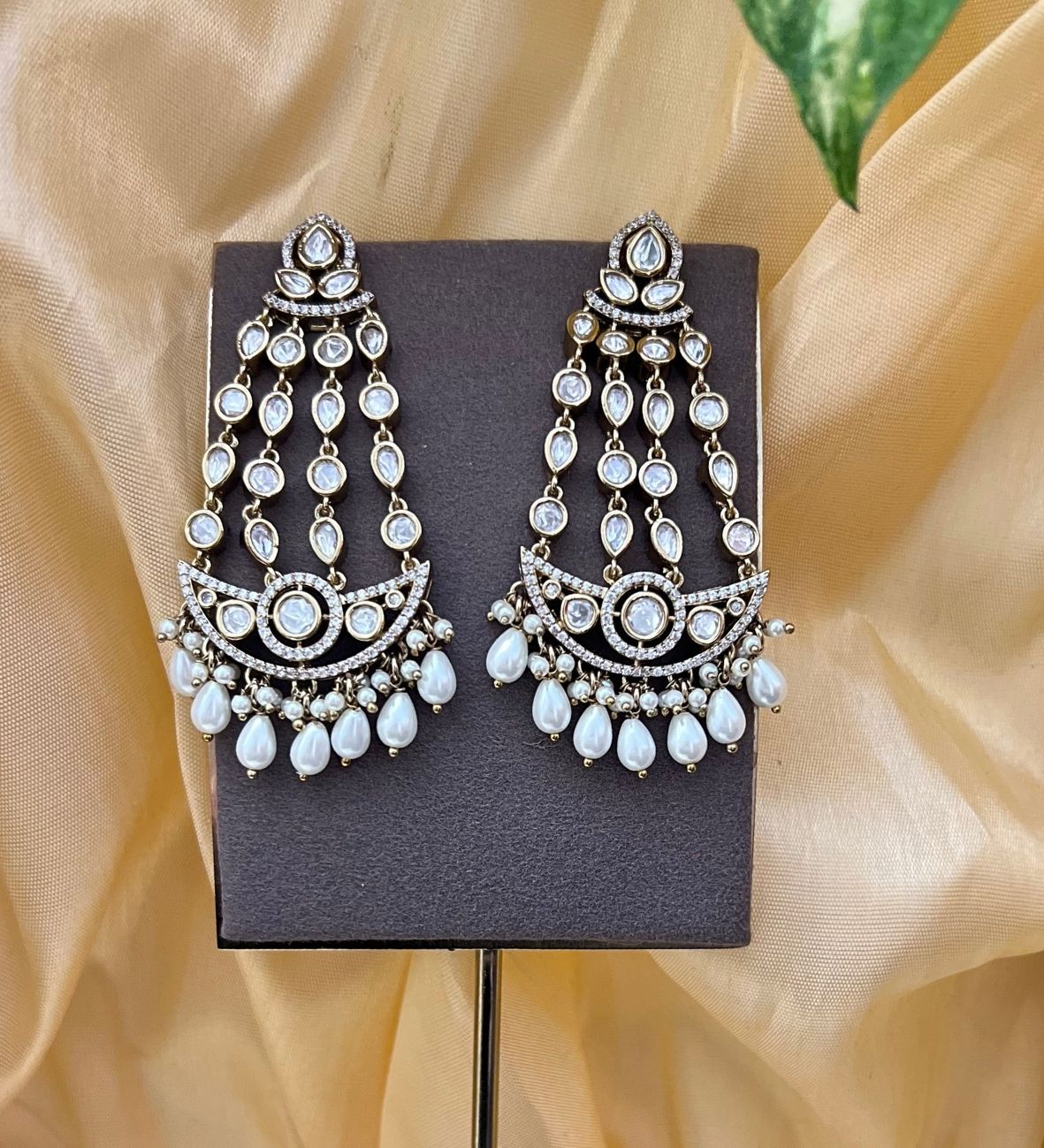 Add a timeless statement to your jewellery collection with these antique kundan long earrings, inspired by classic Indian craftsmanship. Designed with a layered kundan stone arrangement and elegant pearl-style drop detailing, these earrings bring a regal touch to weddings, festive occasions and traditional celebrations.
