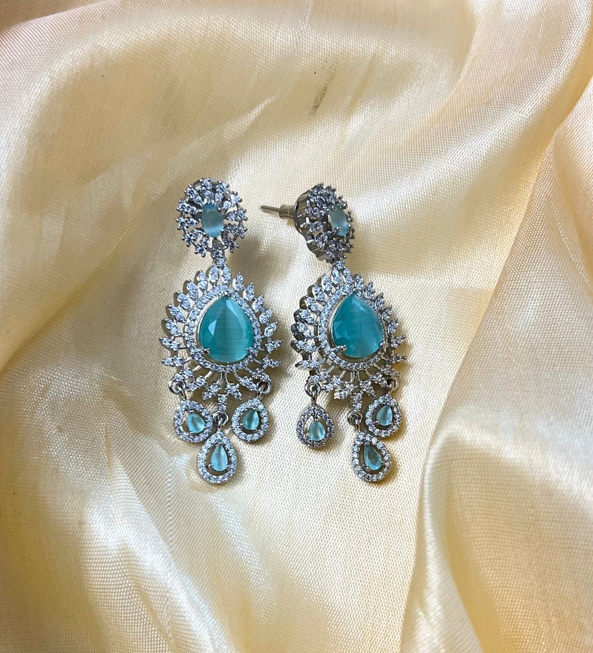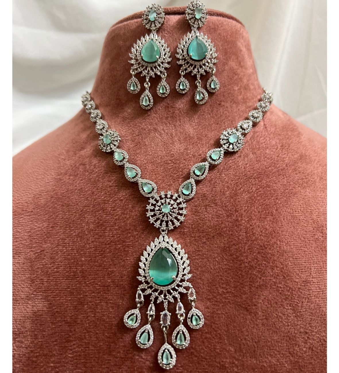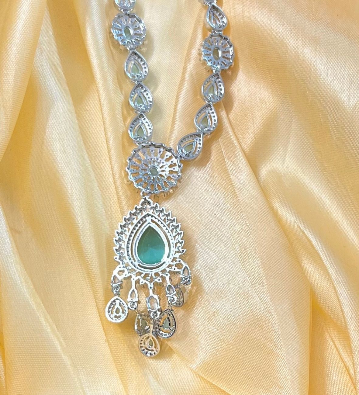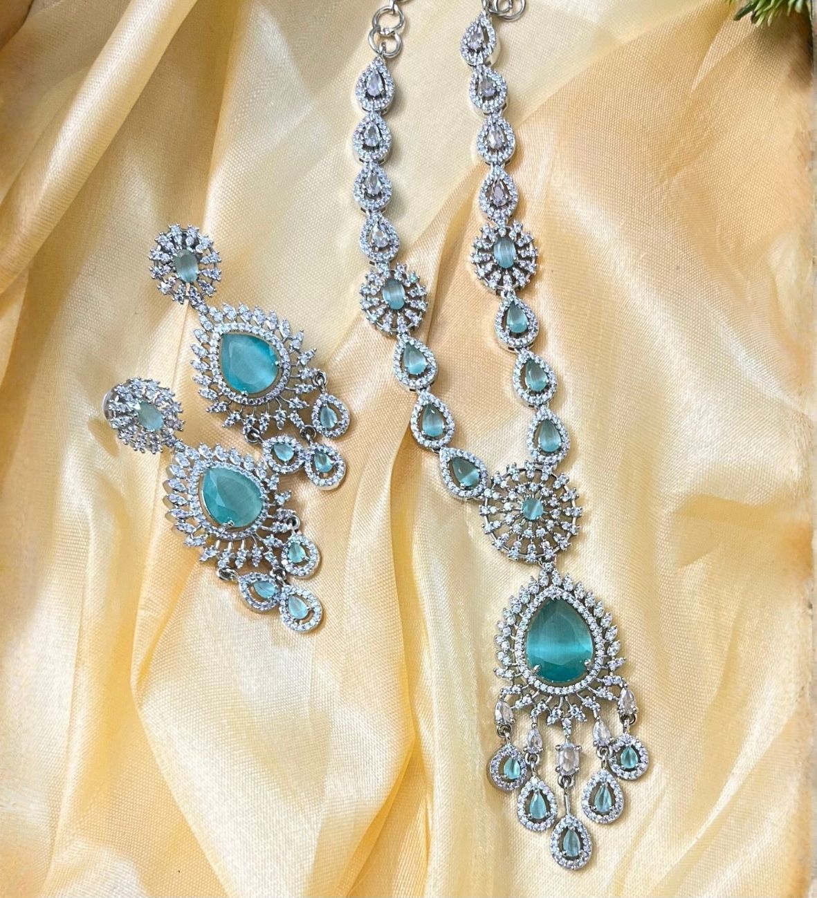 Introducing the Royal Sapphire AD Set, a breathtaking statement necklace and earring duo crafted with deep sapphire-blue teardrop stones and high-shine American Diamonds. The delicate fan-style structure enhances the neckline beautifully, making it an elegant choice for receptions, cocktails, sangeet nights and grand celebrations. Each teardrop stone is outlined with micro-pave AD detailing to create a rich, premium finish that photographs stunningly.